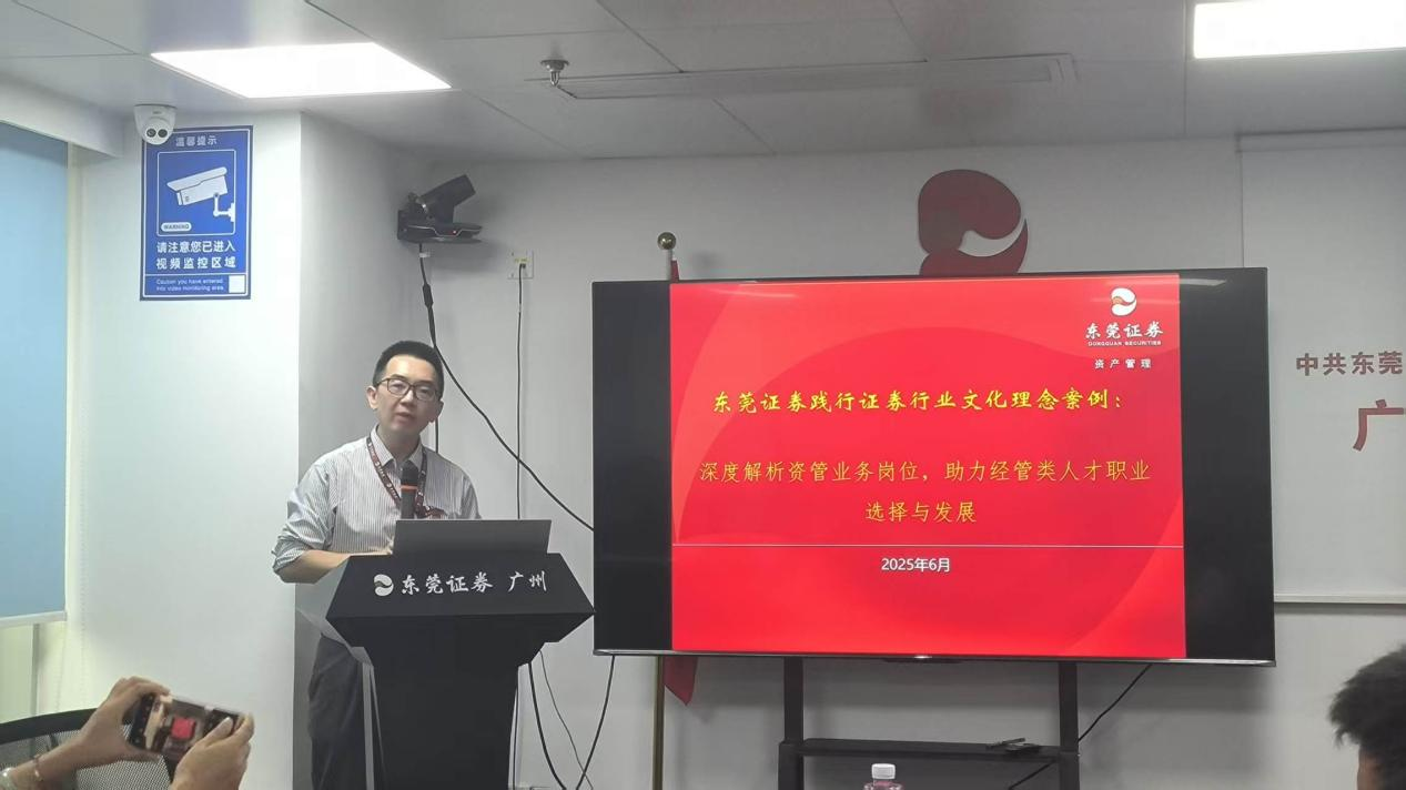东莞证券广州党支部书记吴昭晖在致辞中表示,东莞证券始终以“党建引领,文化铸魂,助推高质量发展”为主线,将党建工作与业务发展深度融合,期待以党建文化建设工作为纽带,为学生职业发展提供实践指引,积极探索落实中证协的文化建设要求,打造为培养“政治坚定、业务精湛、作风过硬”的金融人才、推动证券行业高质量发展注入新动能的样板。
