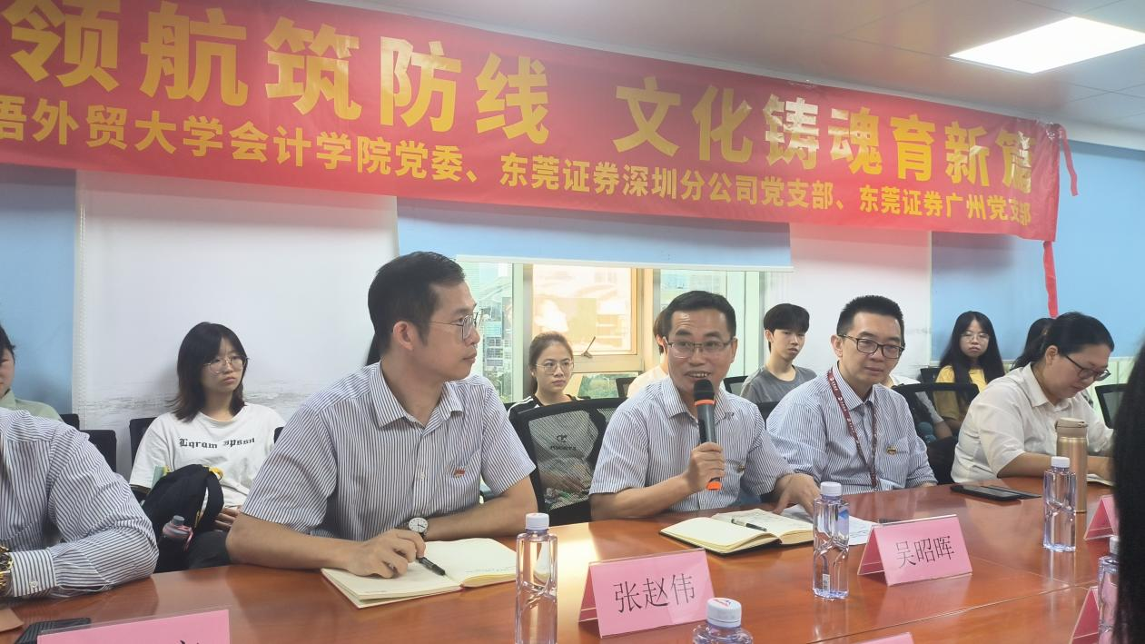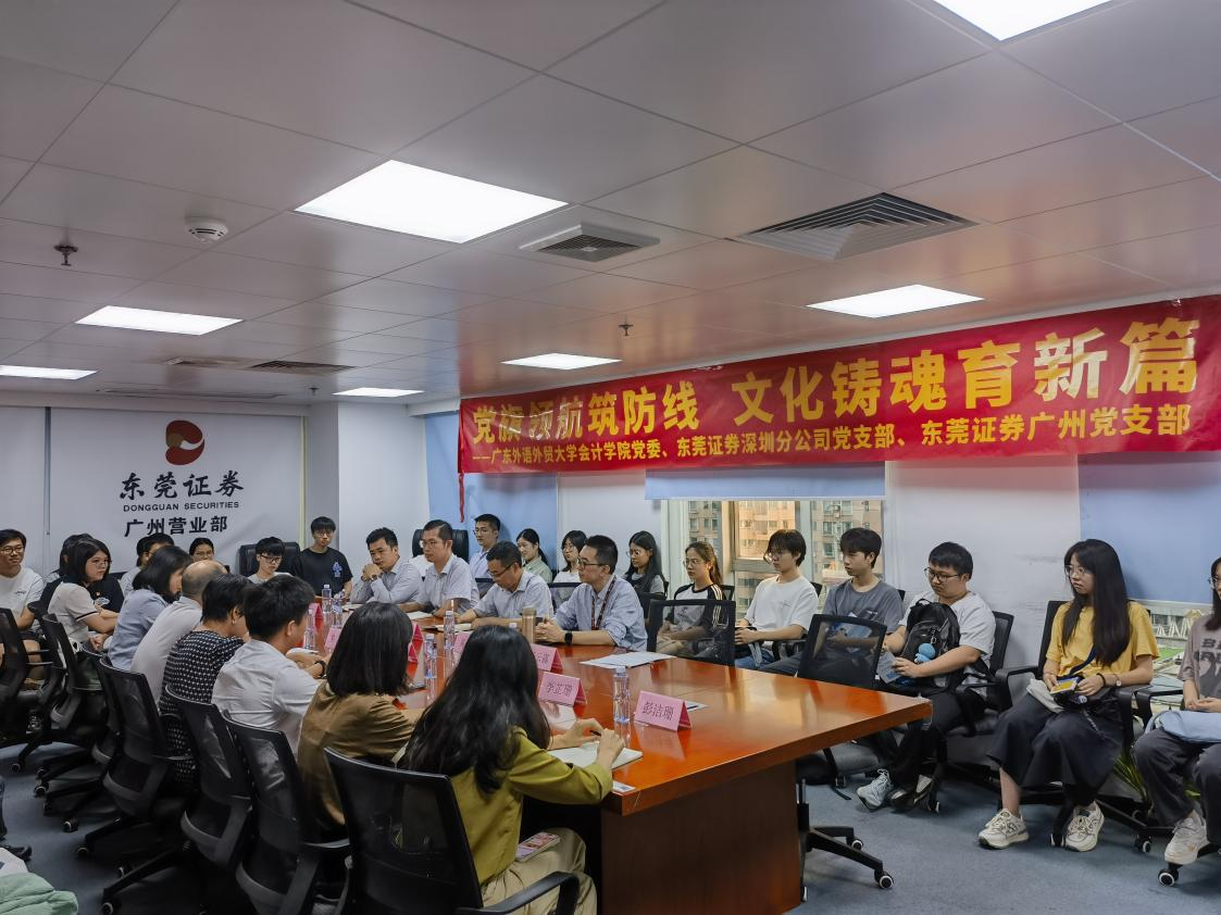 2025年6月12日,伟德bv国际体育党委与东莞证券深圳分公司党支部、东莞证券广州党支部在东莞证券广州营业部会议室举办“党旗领航筑防线 文化铸魂育新篇”主题党日活动。东莞证券广州党支部书记吴昭晖、广外2008级校友张赵伟、李翔宇、谭萍、彭绮琪,东莞证券深圳分公司党支部英飞、杨云露以及其他党员,伟德bv国际体育党委书记黎冬、党委副书记李海琳、财管系教师党支部许红梅、组织员陈瑶、党支部书记刘志鹏、梁萍珍、行政党支部李芷珊、彭洁珊以及学生党员入党积极分子等50余人参加此次活动。