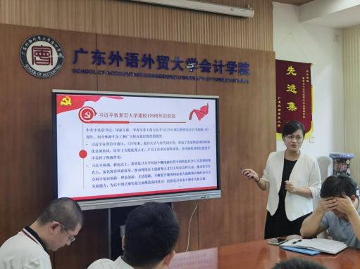 学院党委副书记、纪检委员李海琳结合学生工作分享学习心得,一是正确认识新时代学生特点与学生管理的挑战;二是以改革破题,构建“大思政”格局下的学生管理体系;三是锚定育人目标,培养新时代“复兴栋梁”。财管系教师党支部书记王建业表示,作为一名教师,一是传承红色基因,培养德才兼备的国际化会计人才;二是服务国家战略,推动会计理论与实务创新;三是深化教育改革,提升人才培养质量;四是做新时代会计教育的开拓者。ACCA研究生党支部书记梁萍珍表示,作为一名学生党支部书记和辅导员,一是探索适应新时代要求的教育方法和模式;二是关注学生的全面发展;三是努力营造一个积极向上、和谐包容的文化育人氛围。