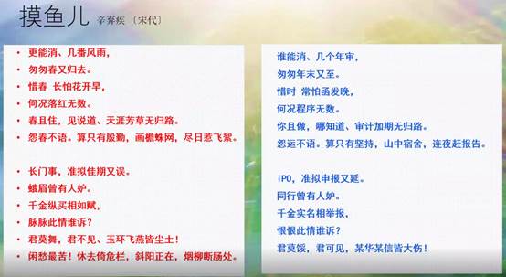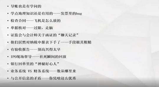 赵睿老师首先以审计风险为切入点,介绍了承接审计项目时应该考虑的因素,包括了宏观政策、经济环境等,接着以诙谐的语言呈现审计师在审计过程中需要注意和保持职业怀疑的细节,包括了公司账套、发票、合同、单据、函证、纳税申报表、验收报告、银行回单等。